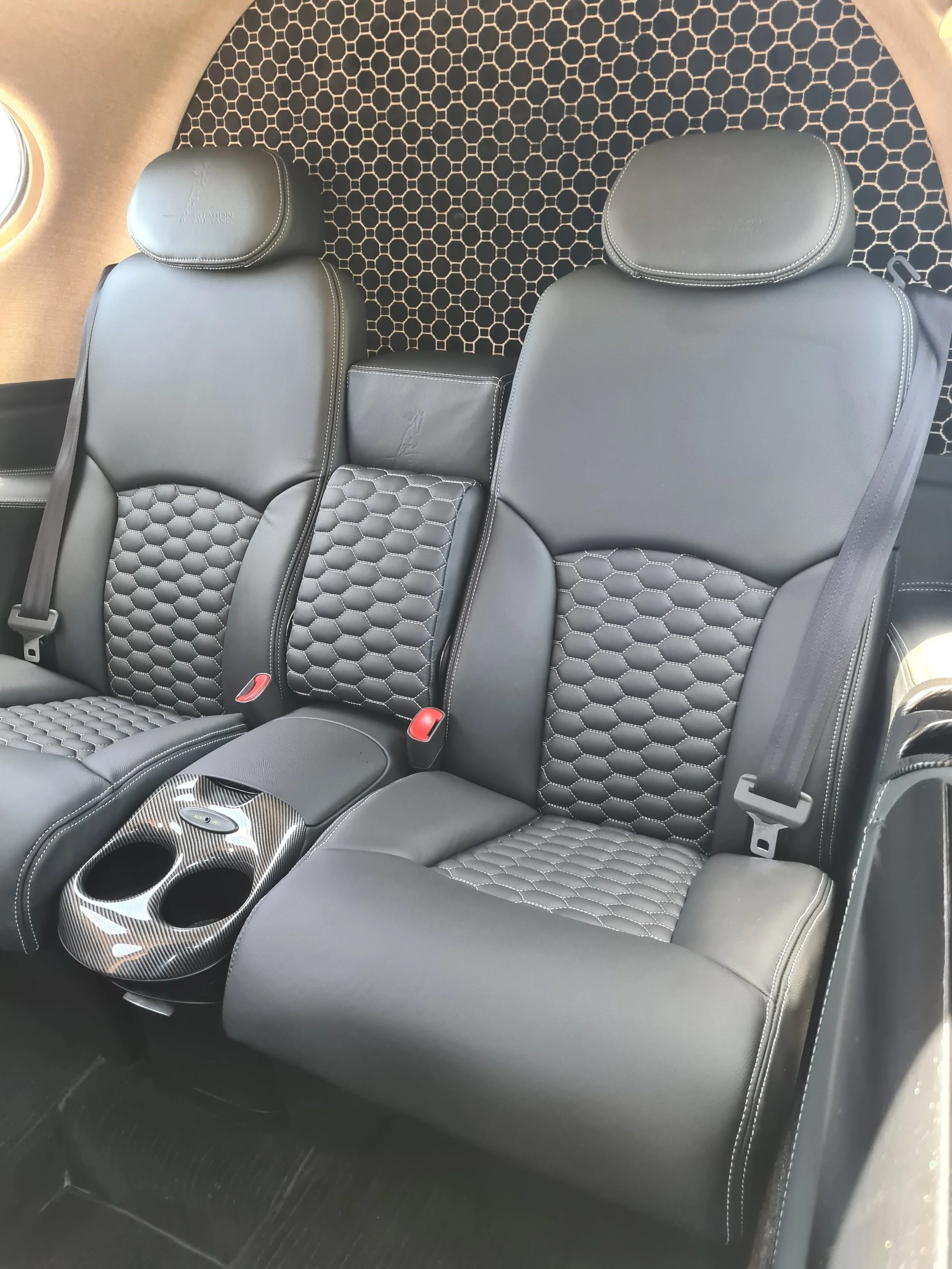 Luxuriously appointed in cream leather throughout the cabin interior; four passengers can enjoy a conversation, indulge in a few drinks, or do business in the club-style seating layout.